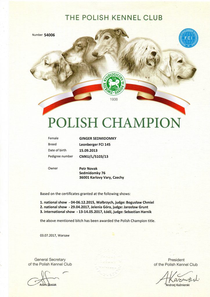 Největší novinkou je, že z Polska přišel diplom pro šampiónku Polska Ginger Sedmidomky.
