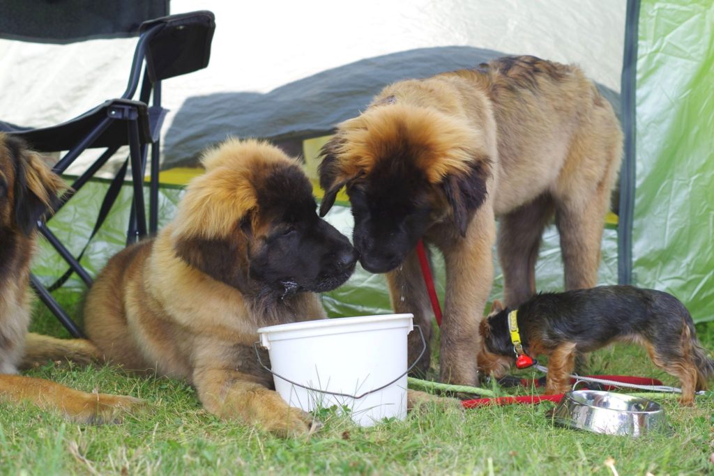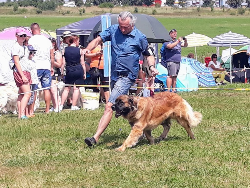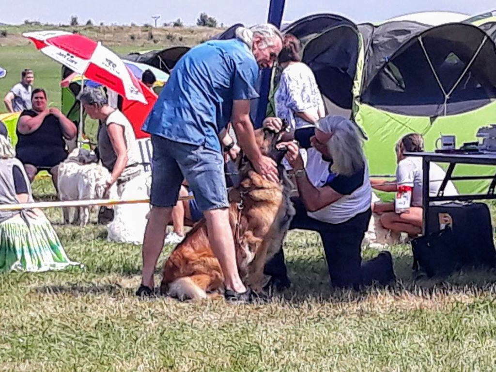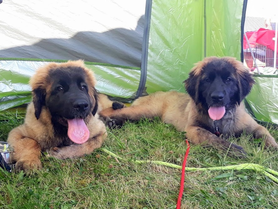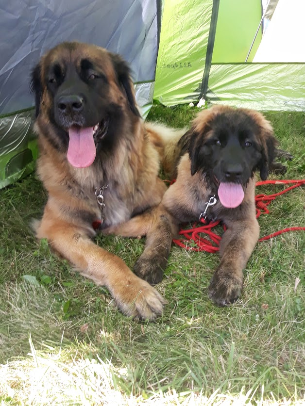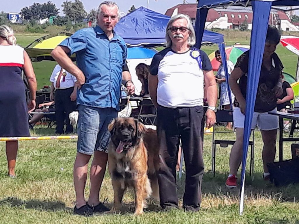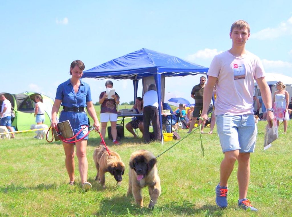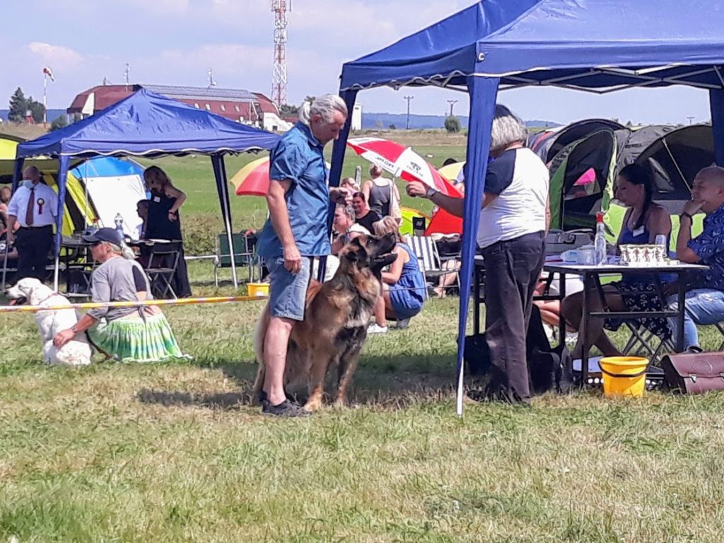 Domluvili jsme se s majiteli holčiček Onni Orange a Orsa Verde, že bychom se mohli sejít a že leonky absolvují svou 1. výstavu. My jsme přihlásili jen Mášu a nakonec, vzhledem k počasí, jeli i jen s Mášou. Leonbergři se dostali na řadu v kruhu kolem poledne, posuzoval Karel Hořák, který se také s ohledem k horku, zdržel dlouhého posuzování pro diváky, neboť ti snad ani nebyli. Moc jsme se těšili na setkání s Tony a Fany a bylo na co. Obě jsou moc pěkné a šikovné. Tony má přísnější výchovu a více toho už umí a pro její majitelku to nebyla první výstava a byla lépe připravená. Fany to ovšem také zvládla i když to pro ni i její majitele byla premiéra. U obou pak v kruhu rozhodčí ocenil tmavé oko, tmavé masky, dobrý pohyb a úhlení. Obě získali ve třídě štěňat, ve věku 4 měsíce a 4 dny, ocenění velmi nadějná, Tony 2 a Fany 1. Do třídy otevřené, po půlroční pauze, nastoupila Masha, trochu otrávená horkem a získala přesto výborná 1 a vítěz třídy, v klání o Krajskou vítězku podlehla šampionce. Výstava se nám líbila, potkali jsme se s mnoha známými a jejich pejsky a po tom se nám už moc stýskalo.